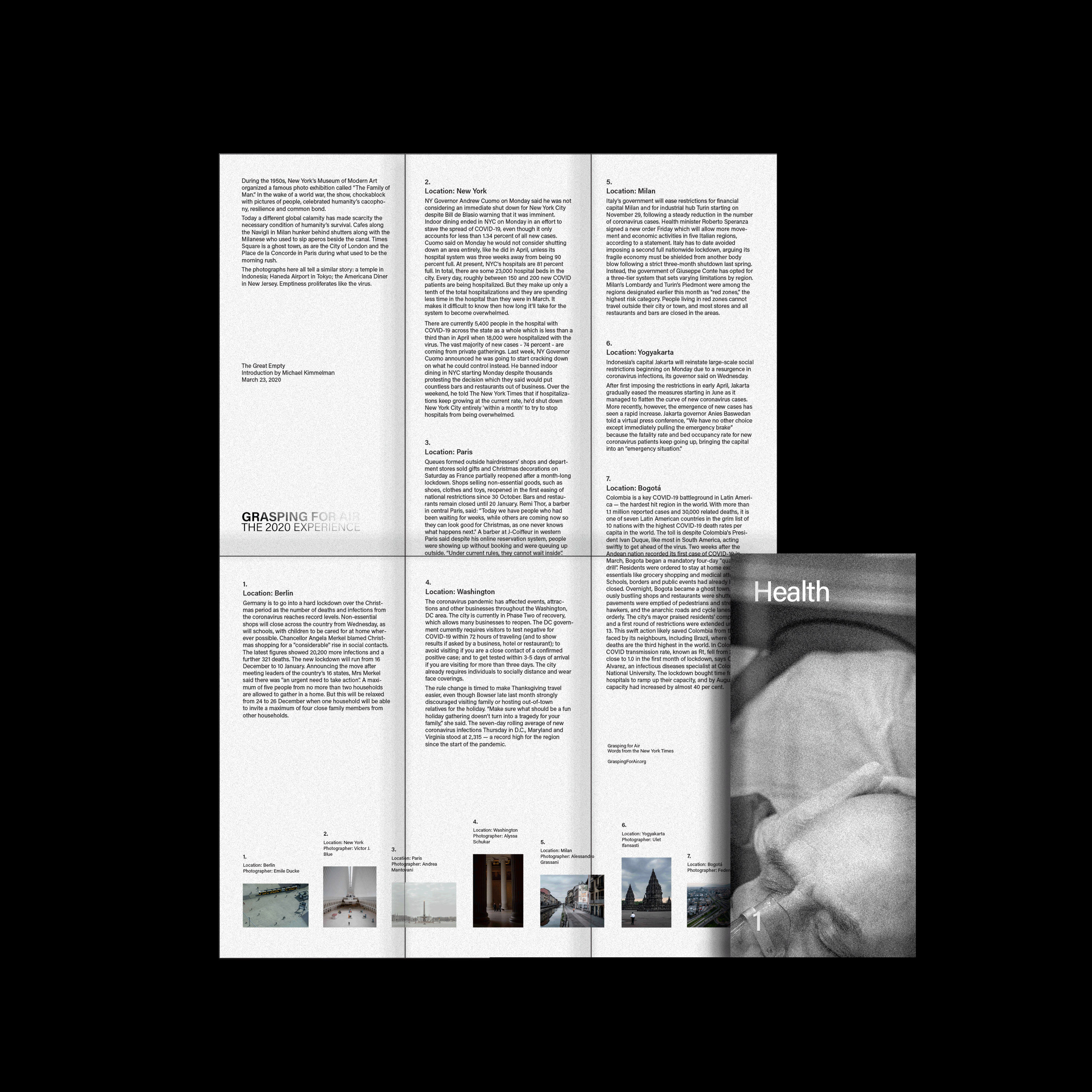 Grasping for Air: The 2020 Experience is an exhibition on how the three themes of 2020—coronavirus, social justice, and climate change—relate to the concept of breath. The goal is to allow visitors to reflect on the difficulties of 2020 and their ability to overcome them.